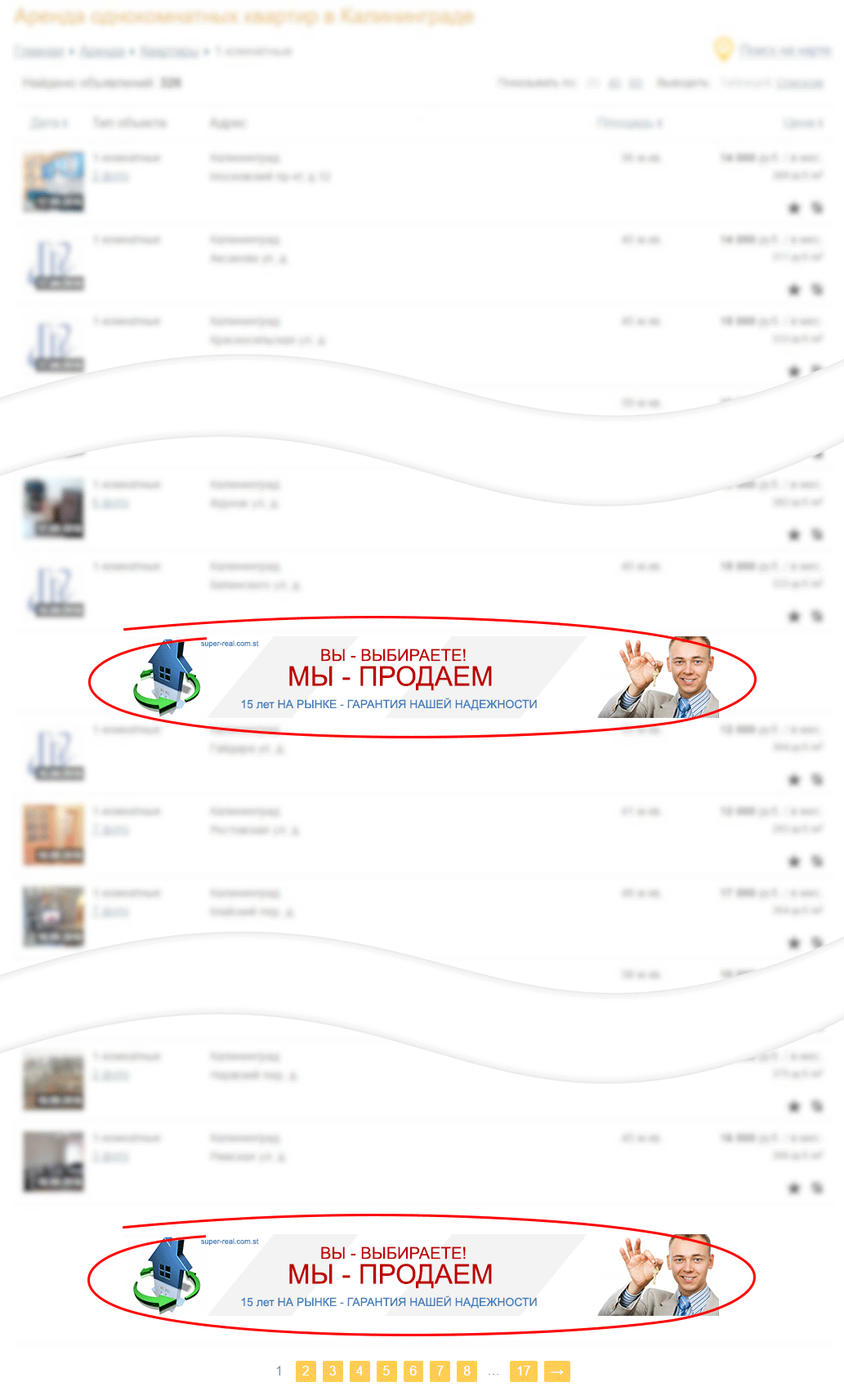 • Баннер отображается во всех списках объявлений (разделы «Аренда», «Продажа», подборки объявлений, поиск).